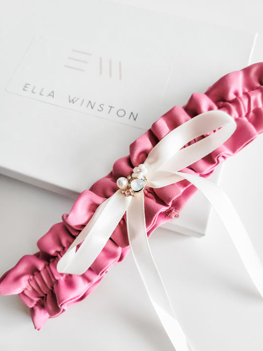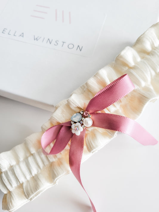 Cream Crinkle Satin Bridal Garter Set With Rose Pink Bow and Floral Jewel Center
