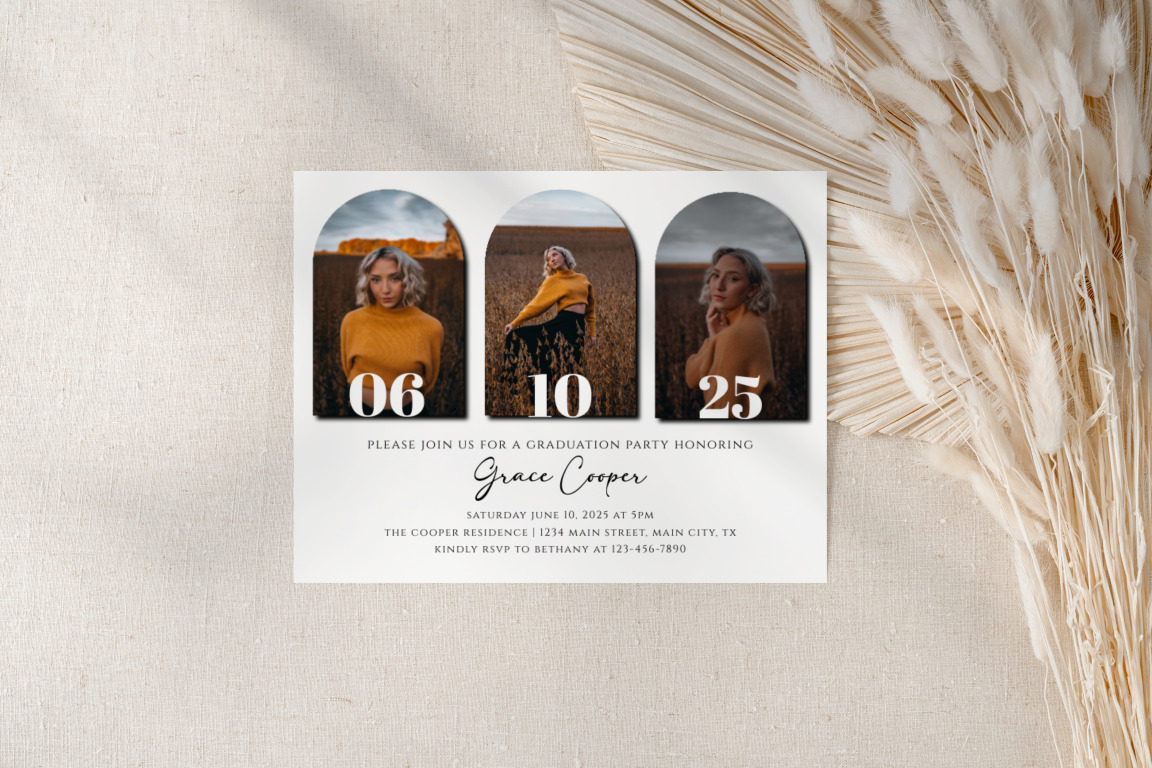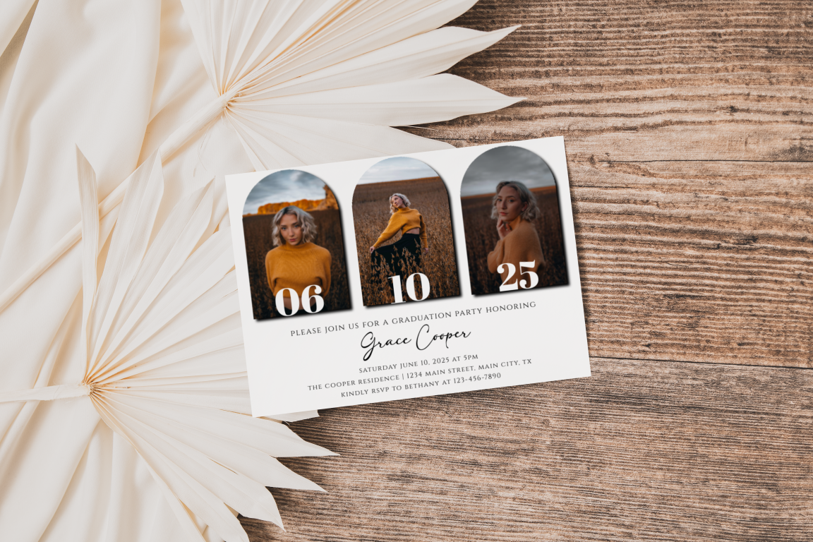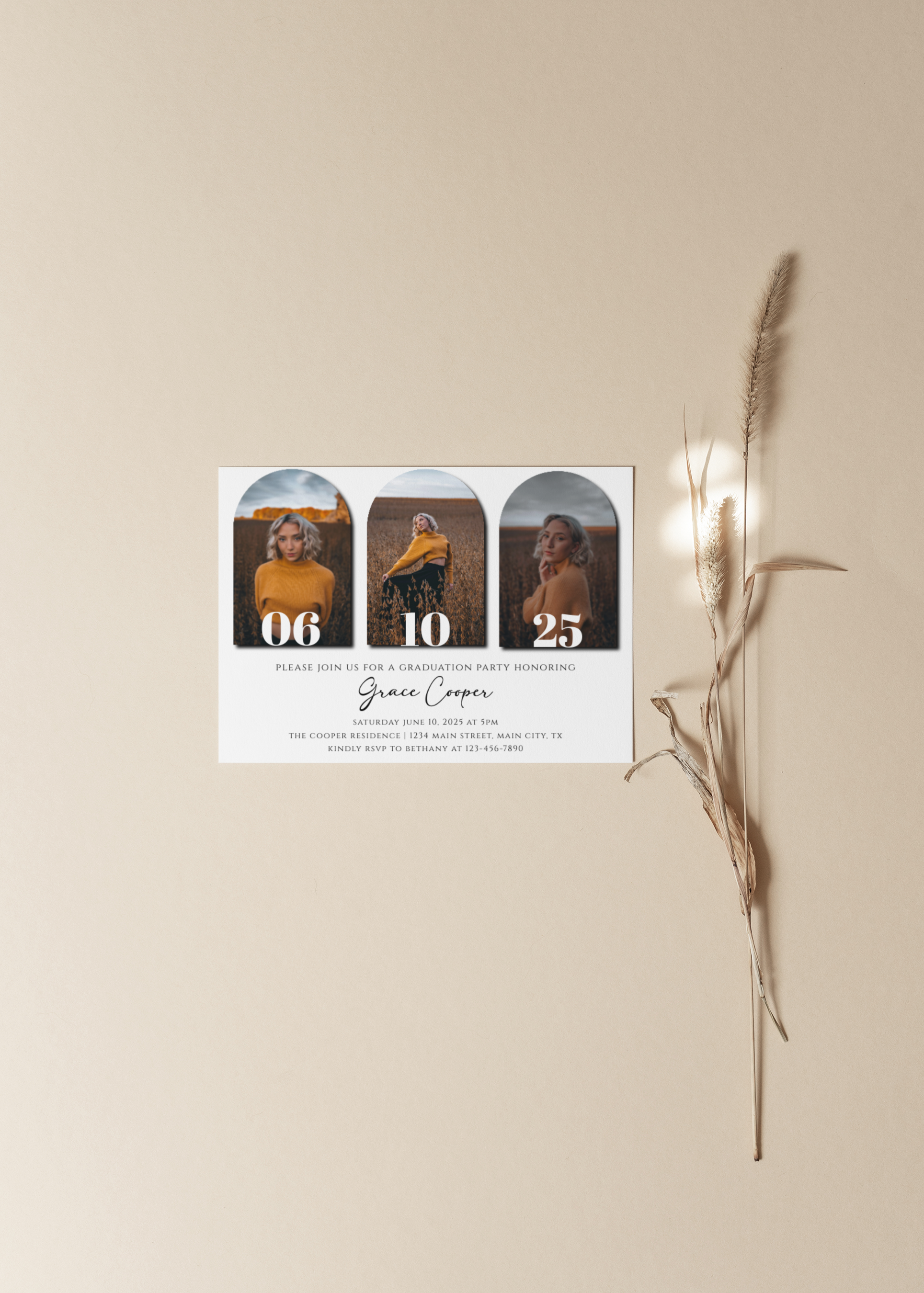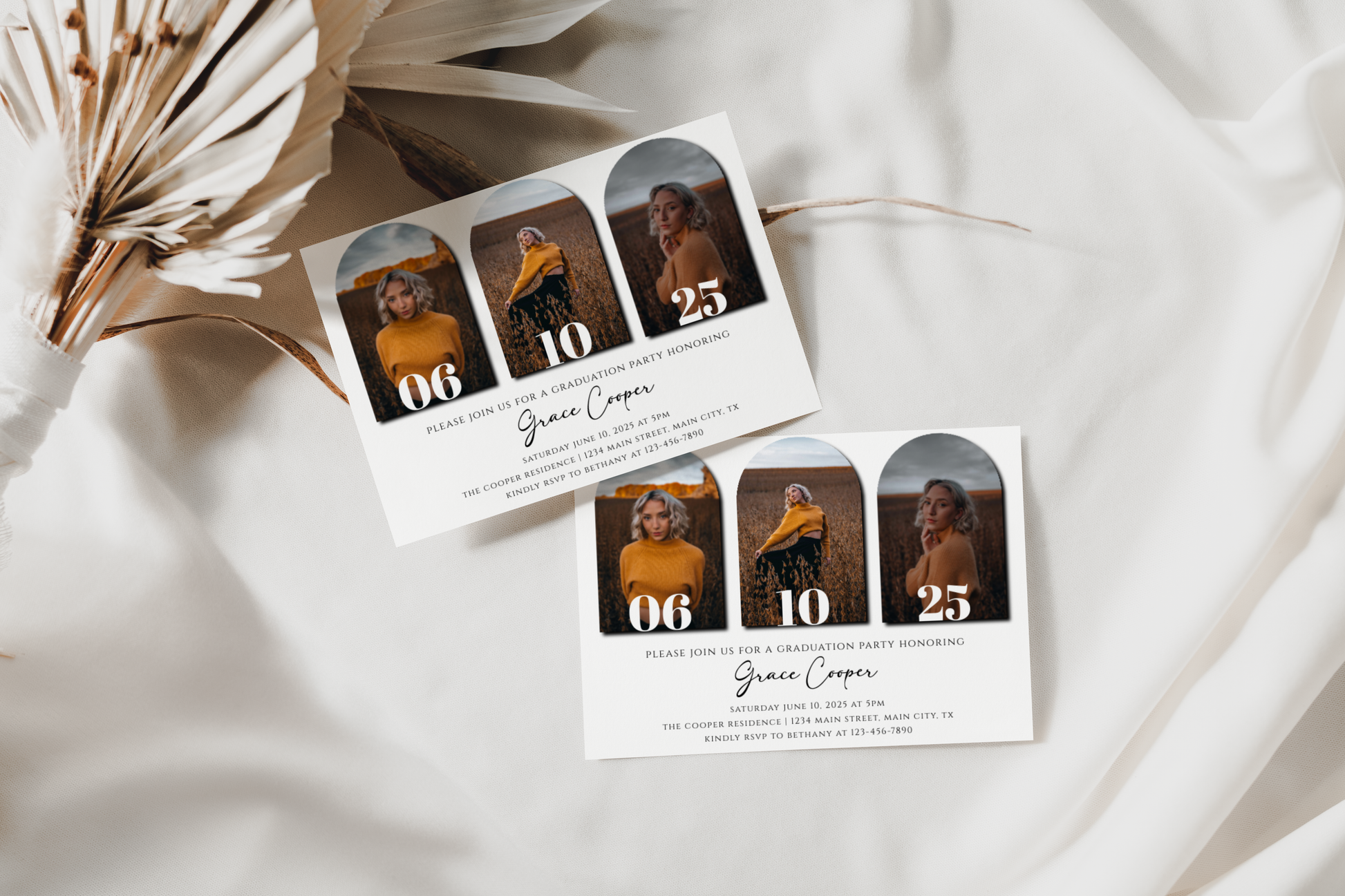 Modern photo collage graduation party invitation template. Includes one 5x7 inch card. Easily editable and totally customizable.