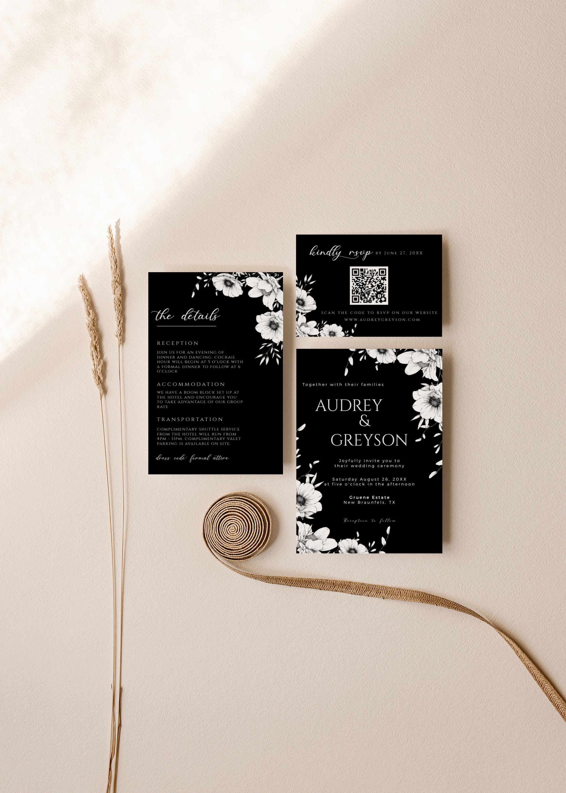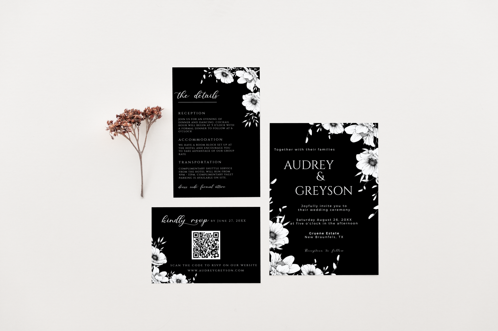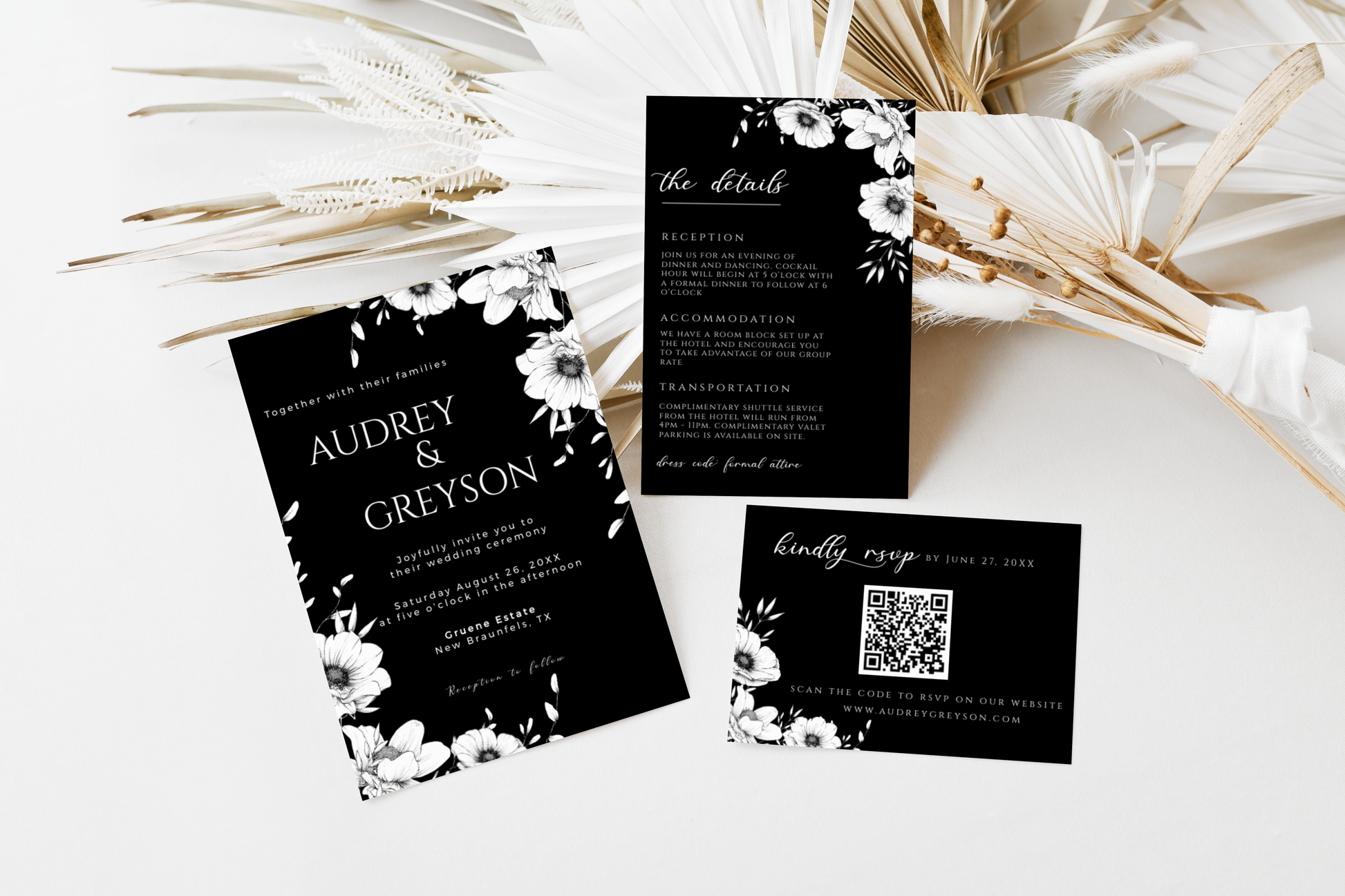 Modern black anemone invitation suite complete with one 5x7 invitation, one 4x6 details card and one 5x3.5 RSVP card. All are easily editable and totally customizable.