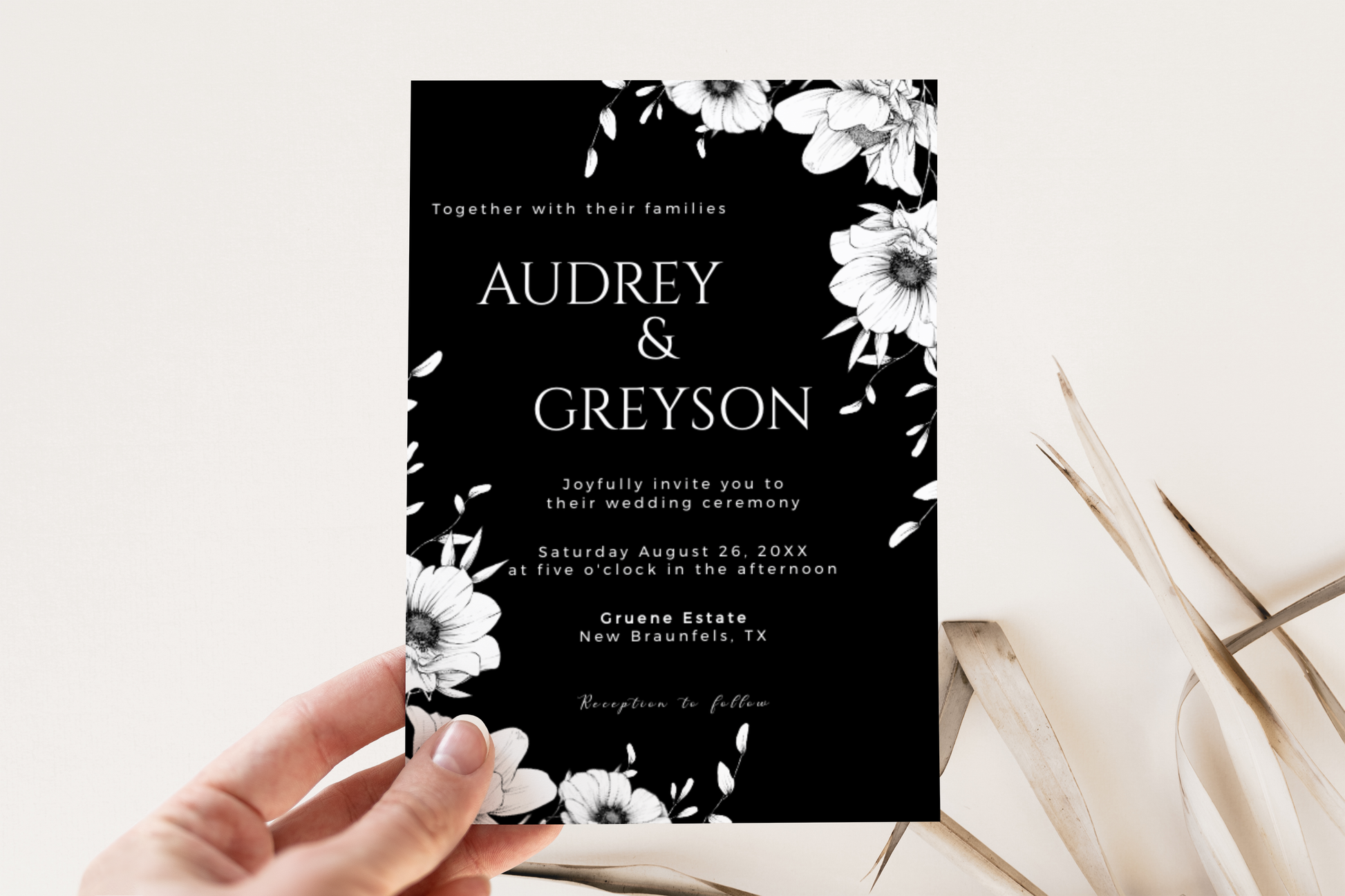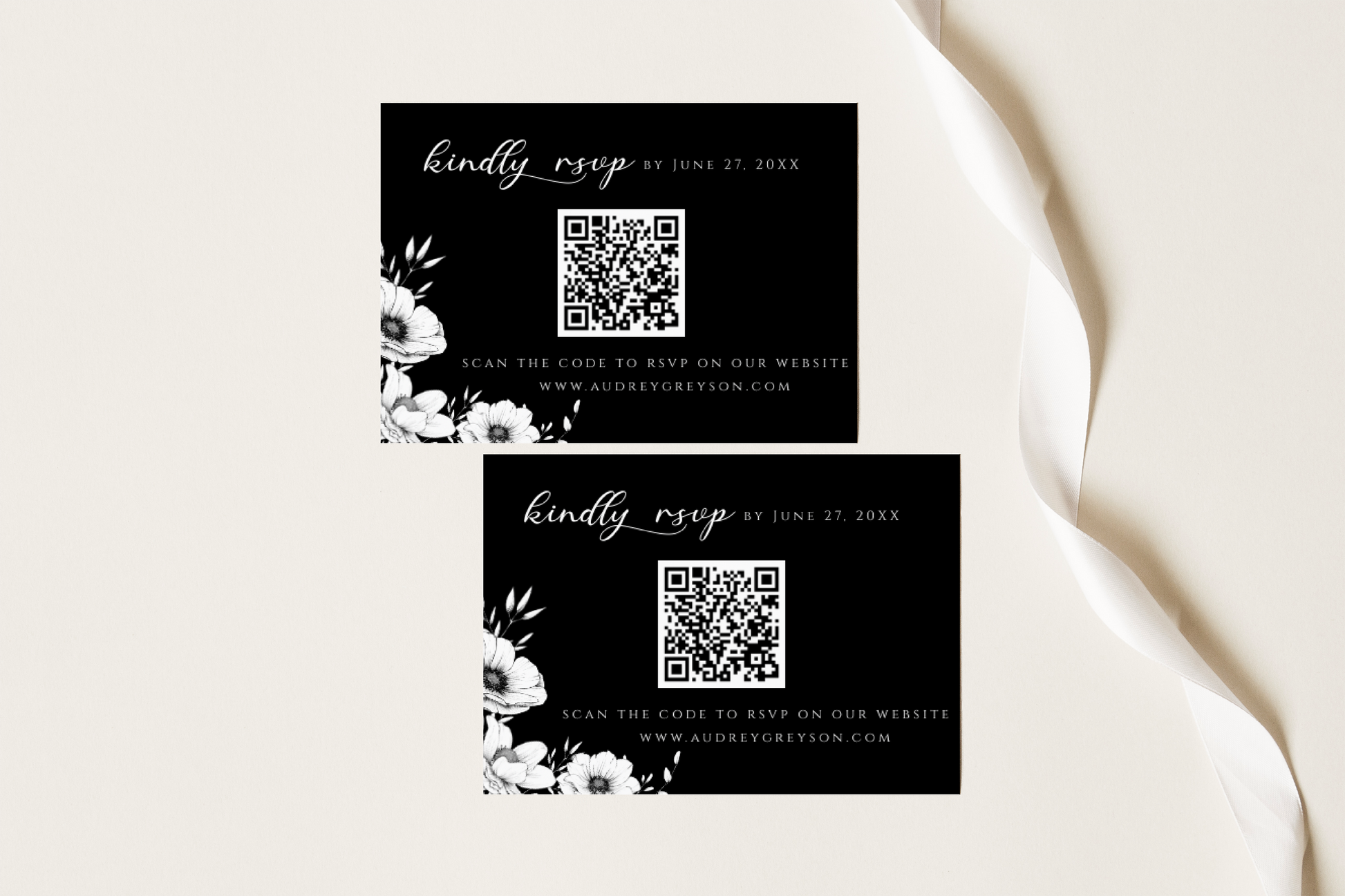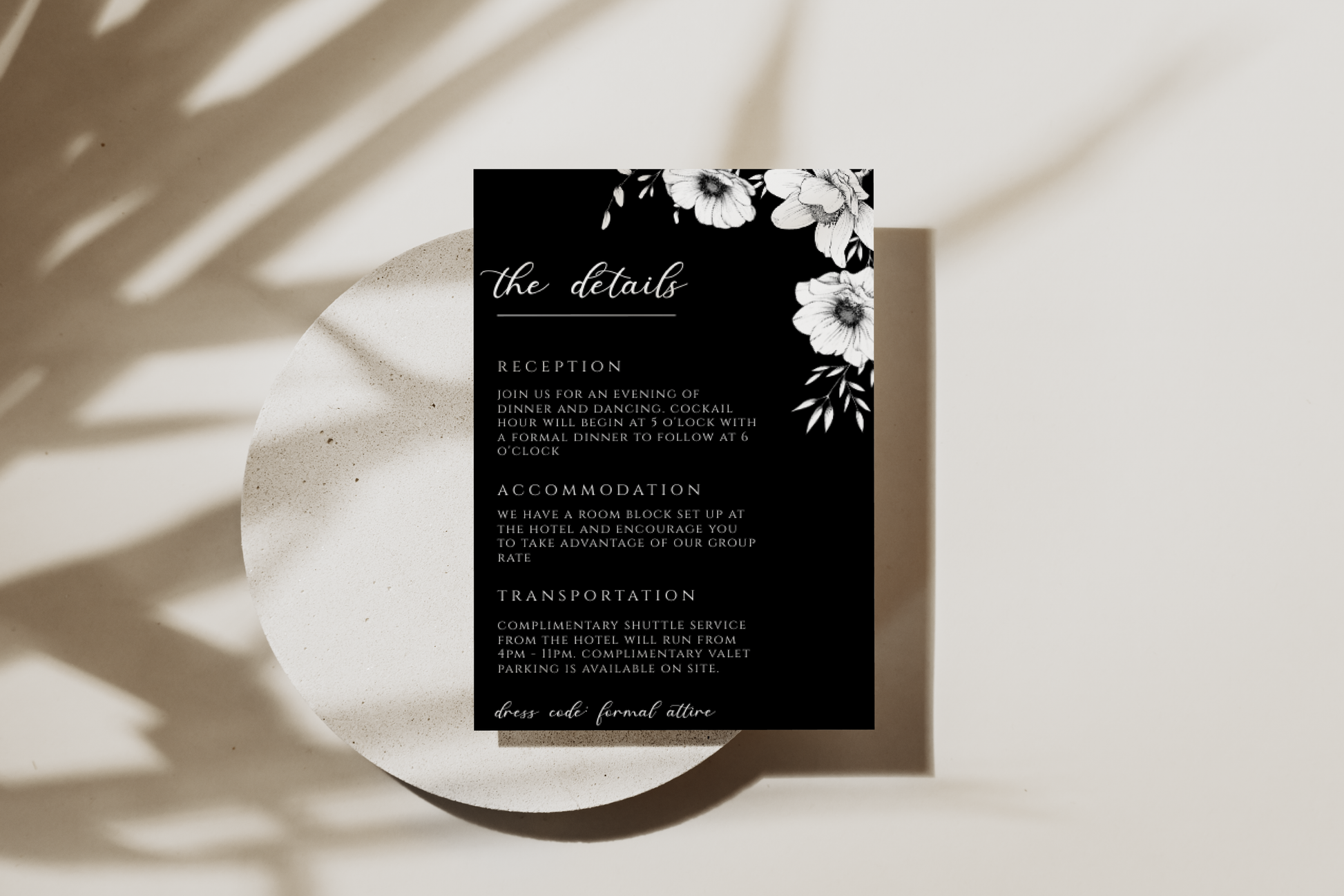 Modern black anemone invitation suite complete with one 5x7 invitation, one 4x6 details card and one 5x3.5 RSVP card. All are easily editable and totally customizable.
