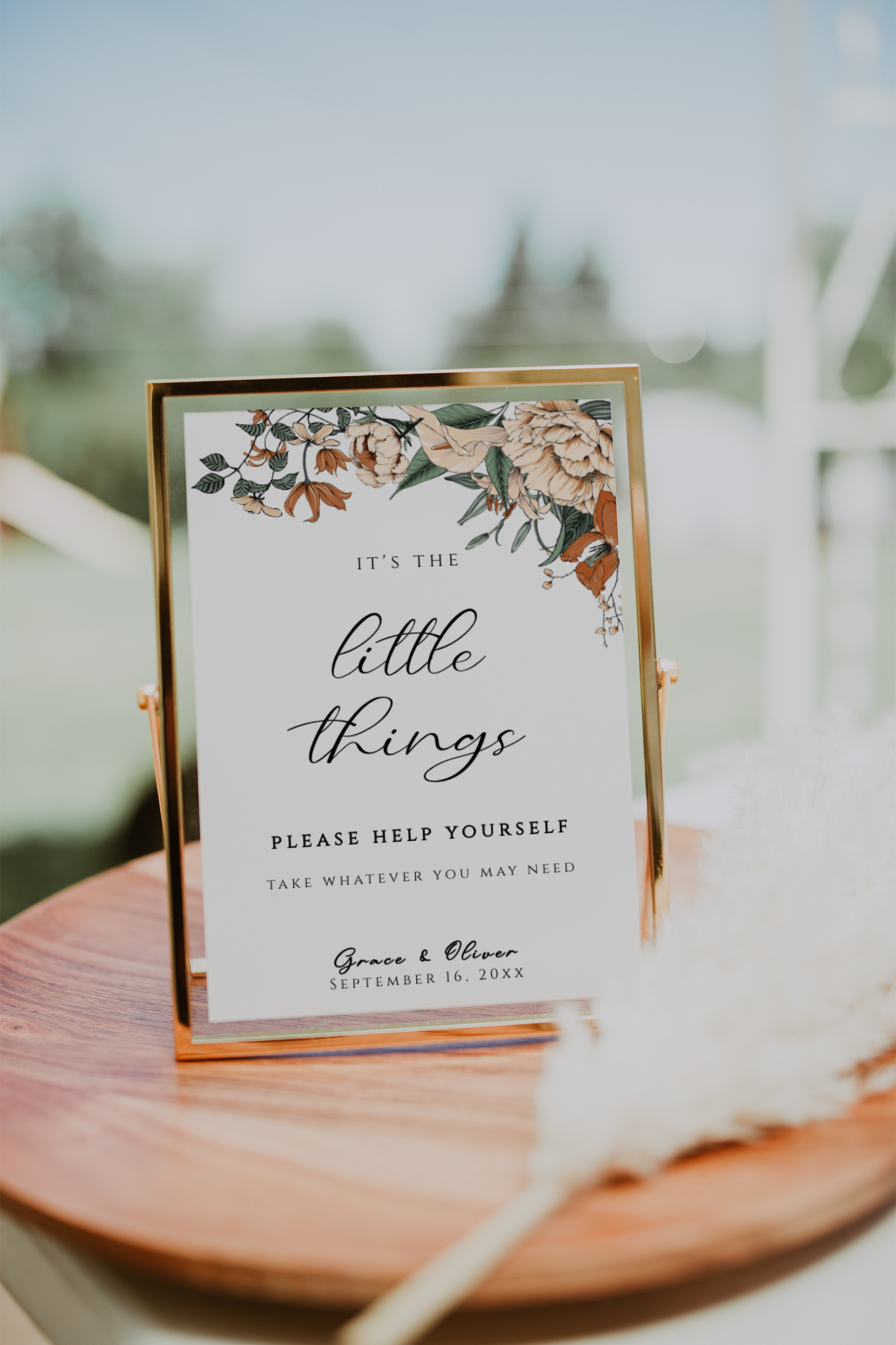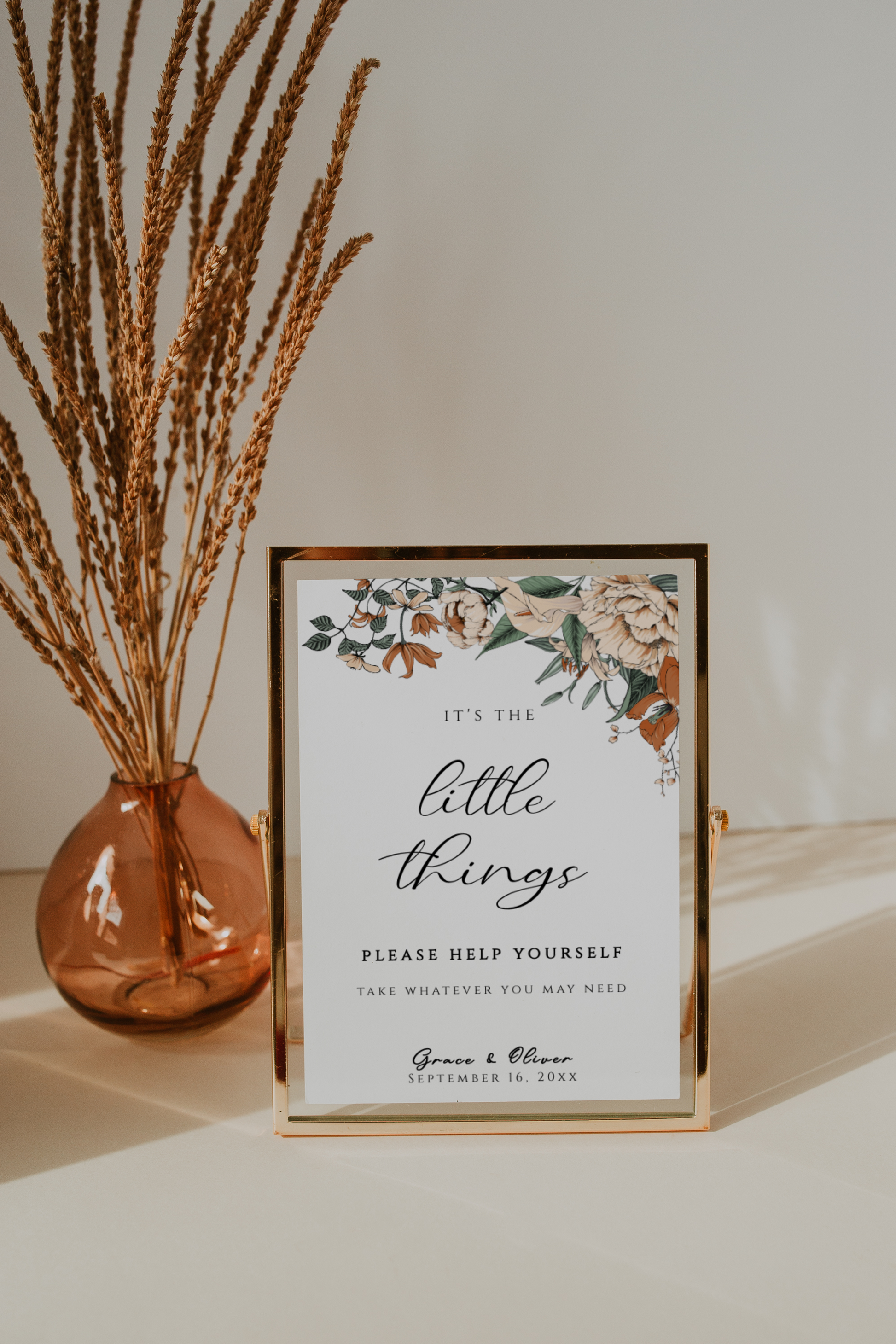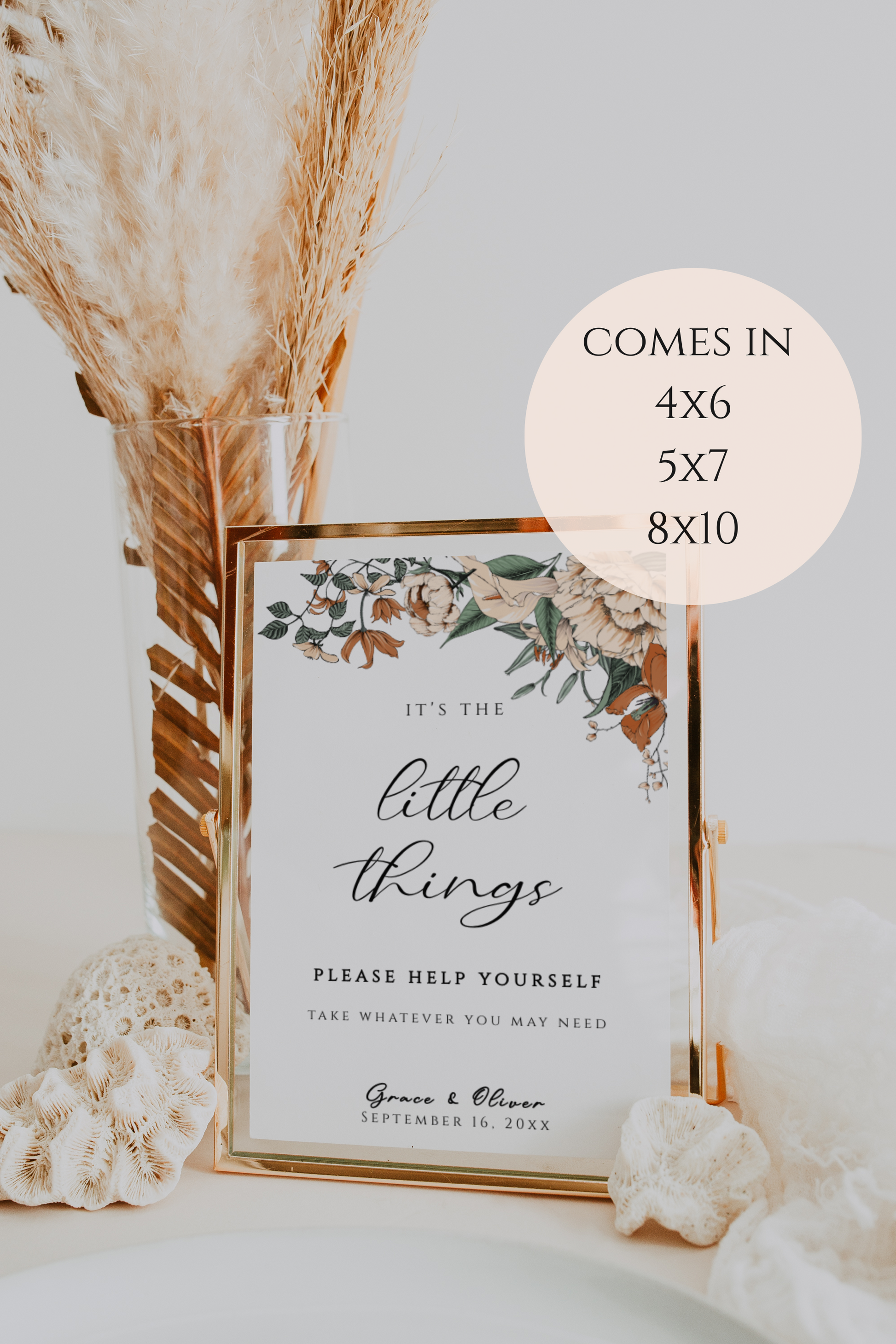Printable bathroom basket sign template with cream and burnt orange florals. Comes complete with one 4x6 inch sign, one 5x7 inch sign and one 8x10 inch sign. All are easily editable and totally customizable.
