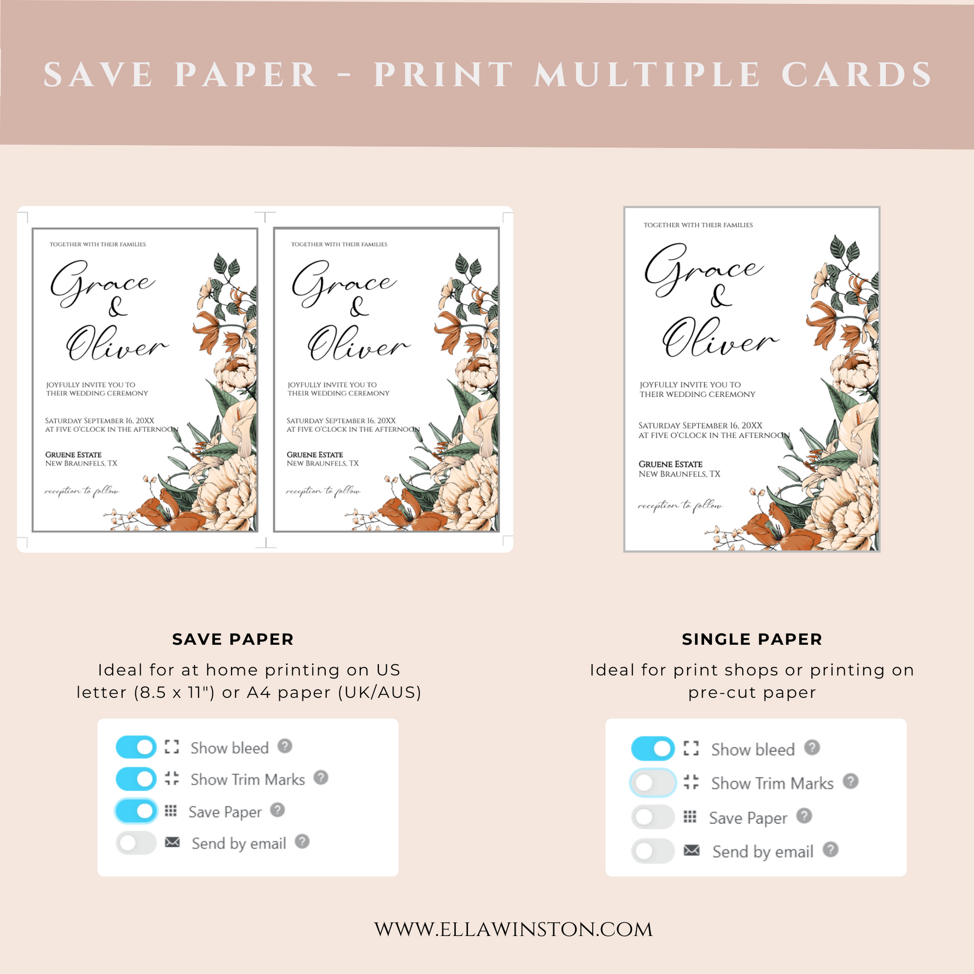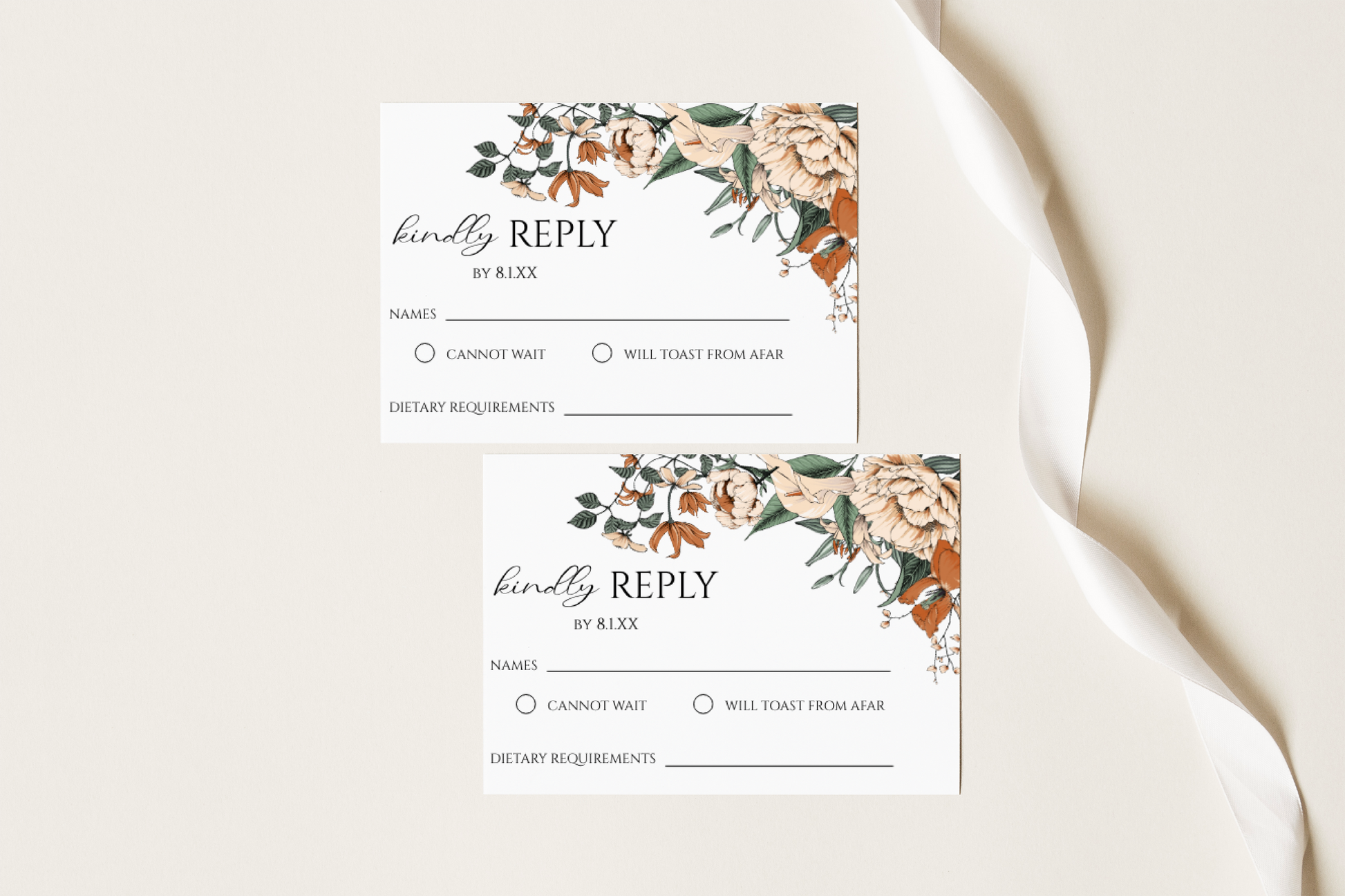 Cream and burnt orange boho floral invitation suite comes complete with one 5x7 invitation, one 6x4 details card and one 5x3.5 RSVP card. All are easily editable and totally customizable.