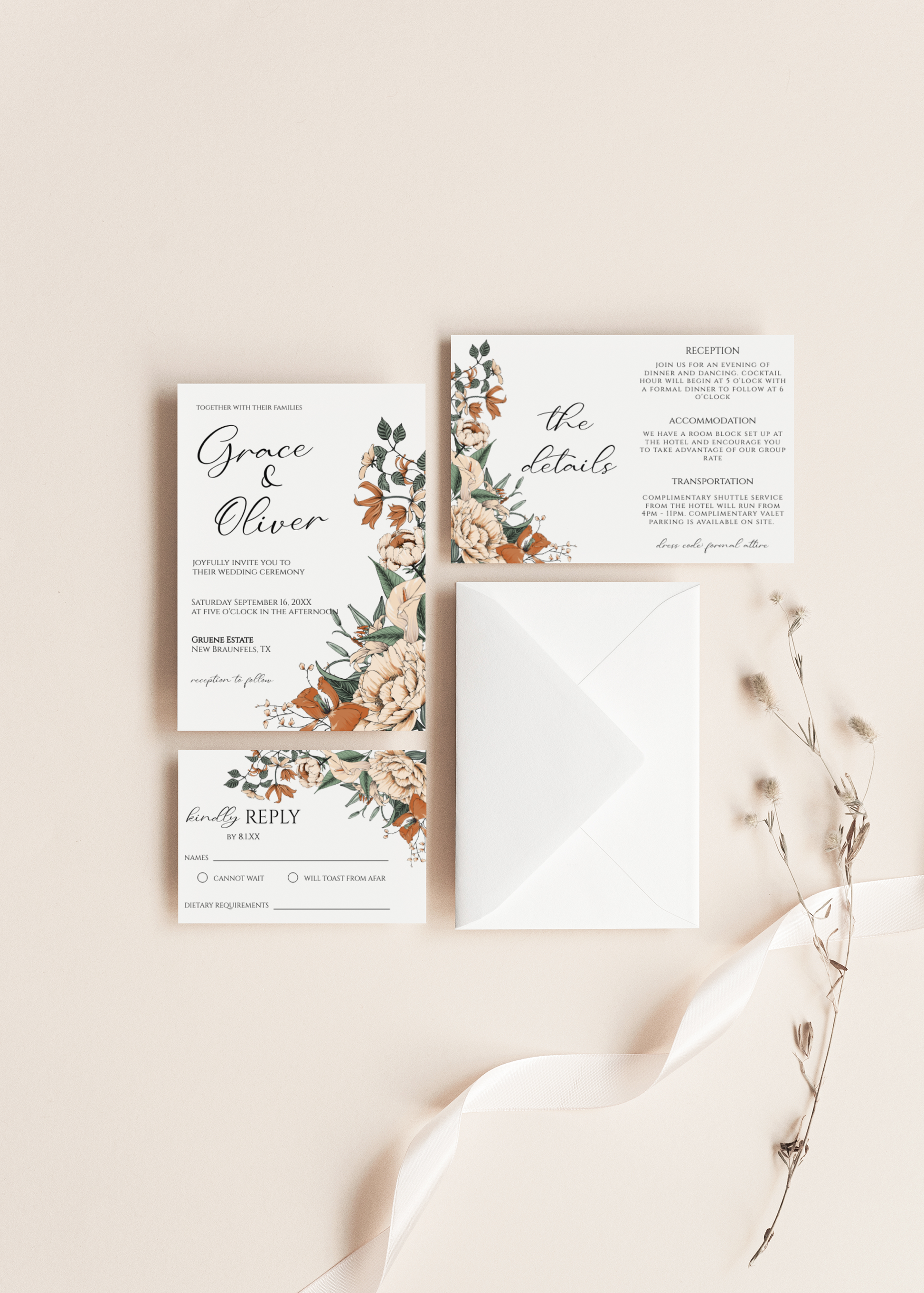 Cream and Burnt Orange Floral Wedding Invitation Suite