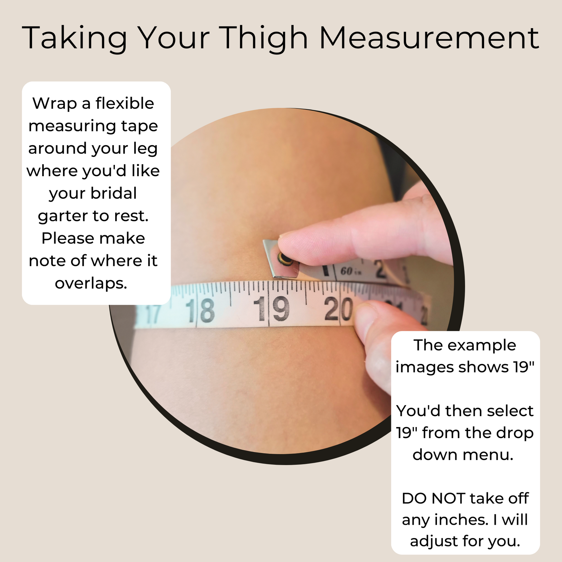 Please do not take off any inches from this measurement. I will make the adjustments necessary to ensure a snug and comfortable fit for your bridal garter.