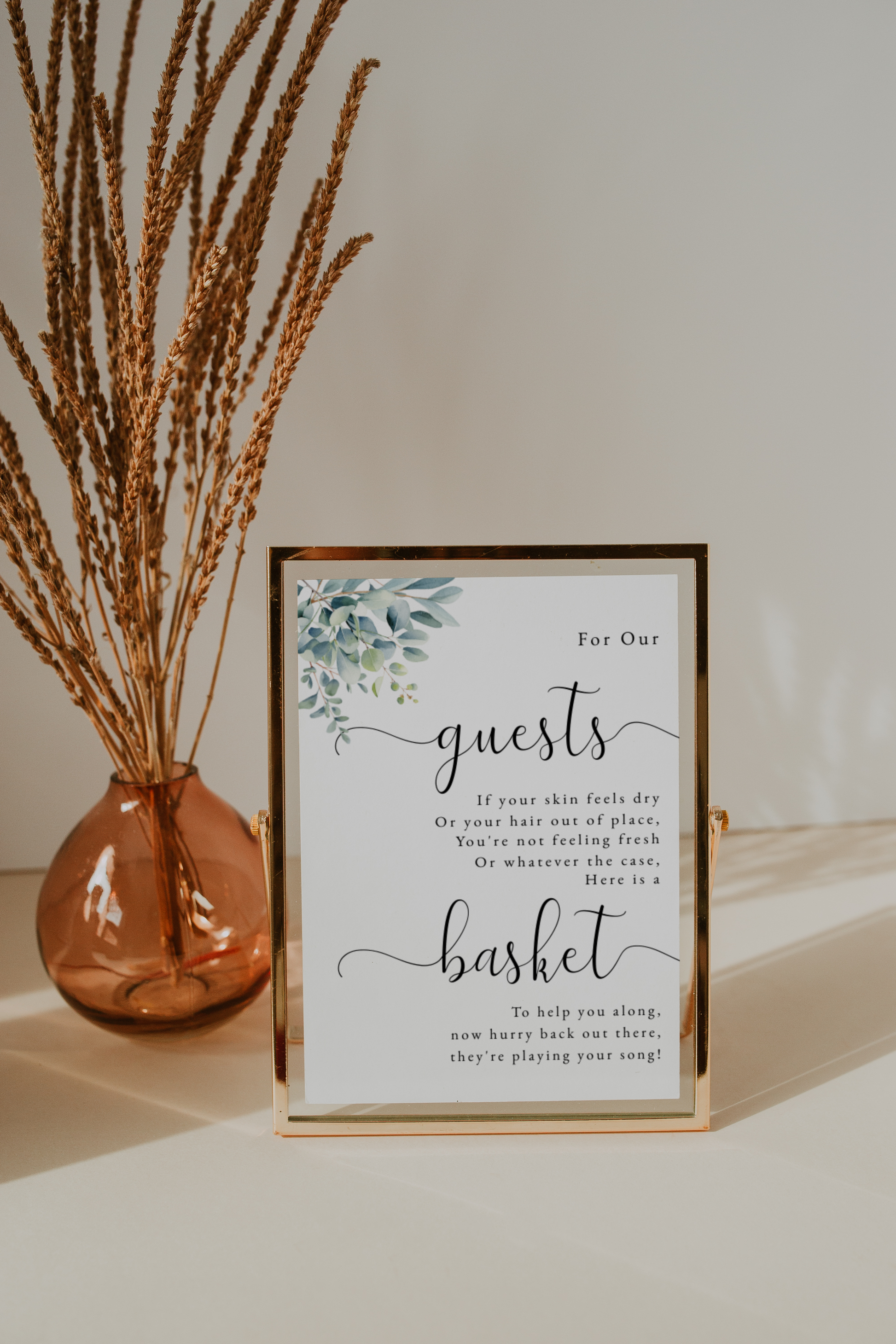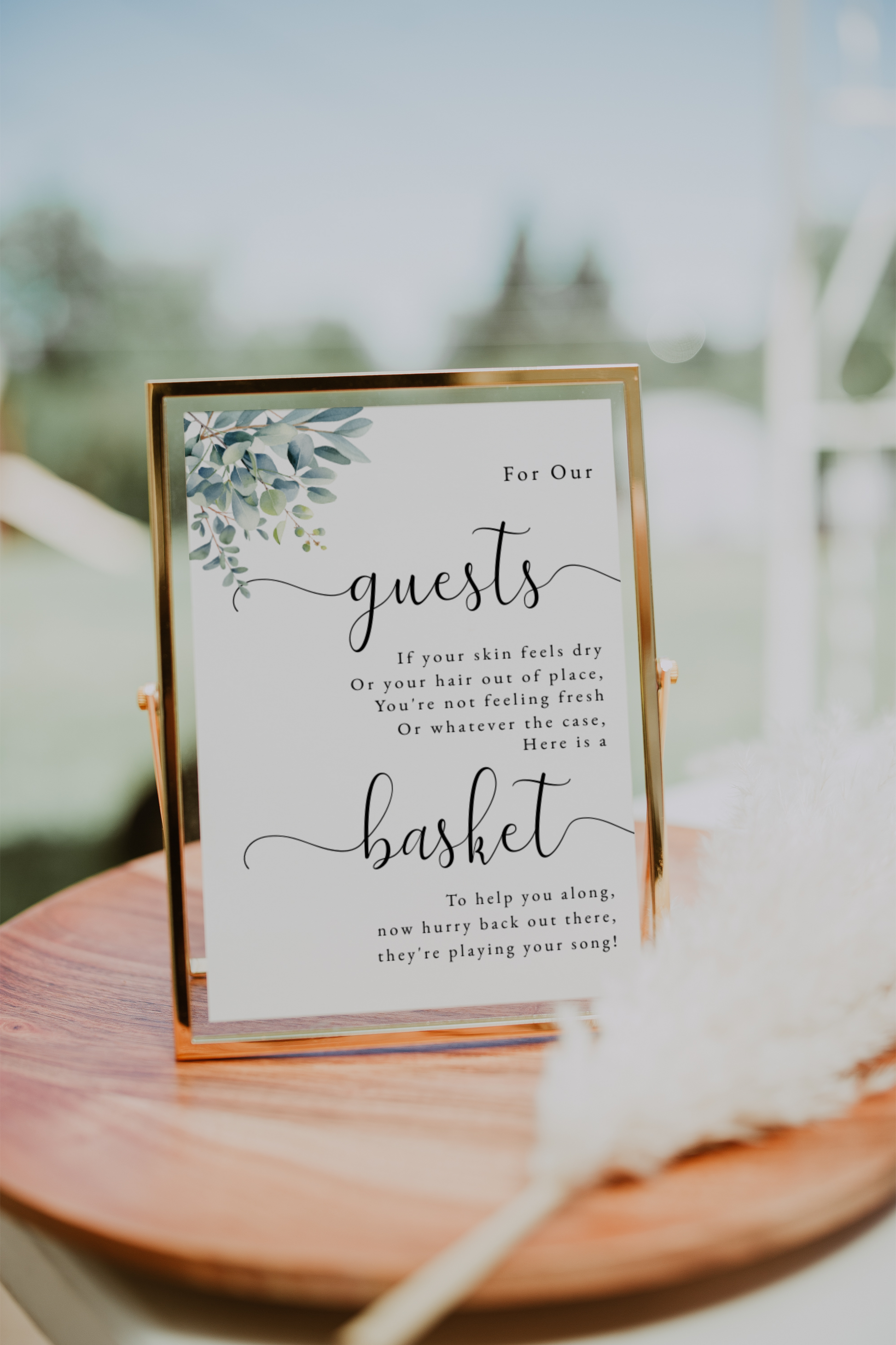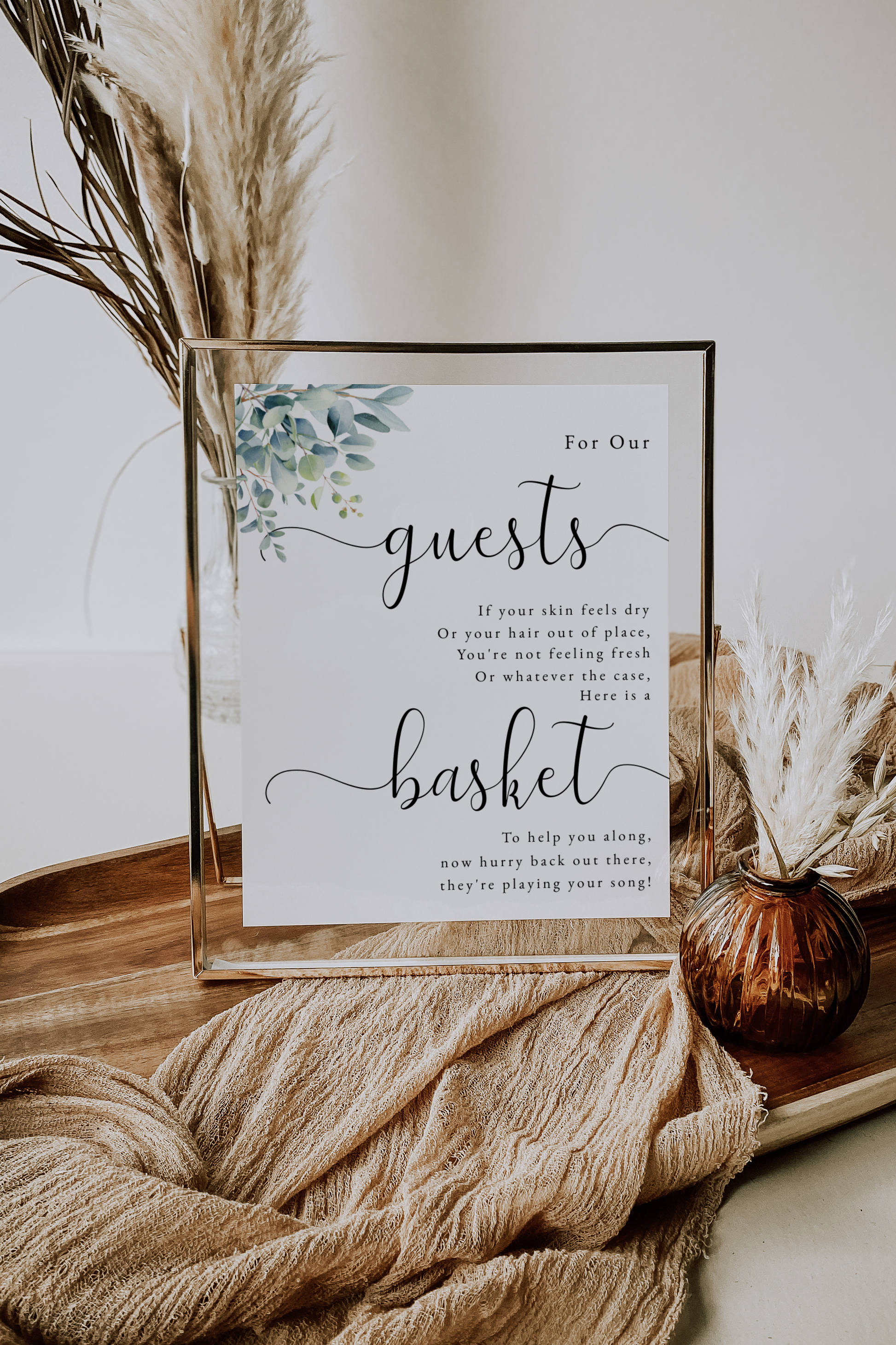 Modern eucalyptus printable bathroom basket sign. Leave this beautiful sign near a basket full of essentials for your wedding guests. Includes three sign sizes: 4x6, 5x7 and 8x10. All are easily editable and totally customizable.