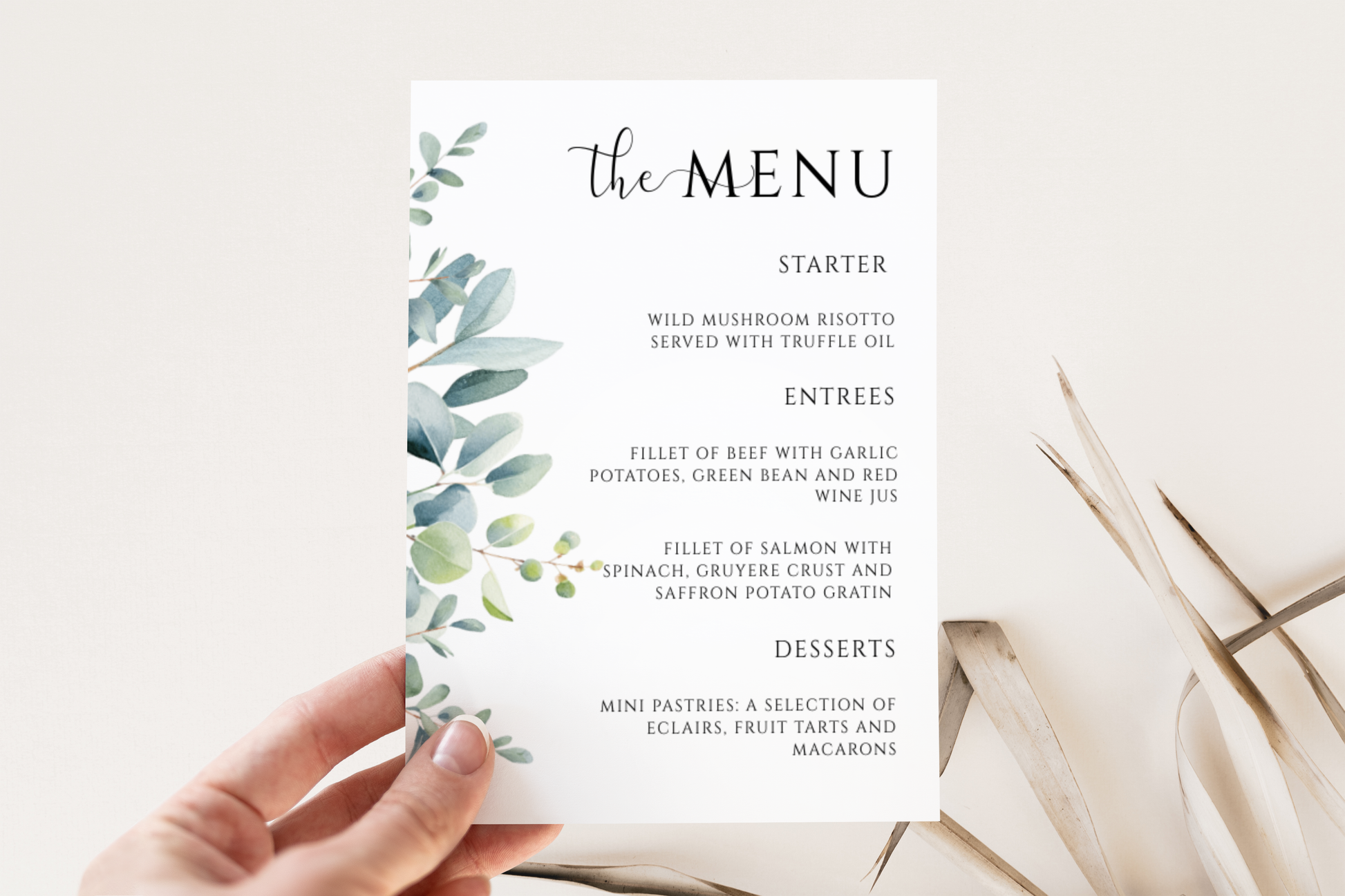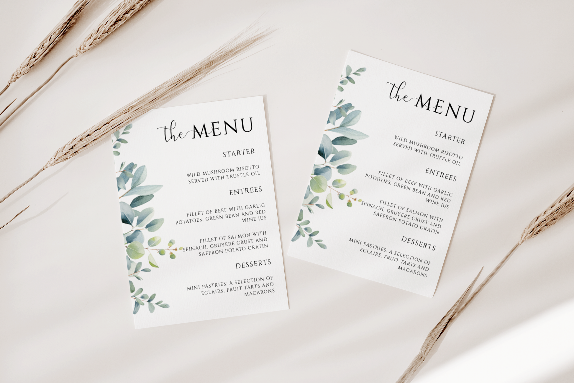 This beautiful eucalyptus wedding menu card is elegant and easy to customize!