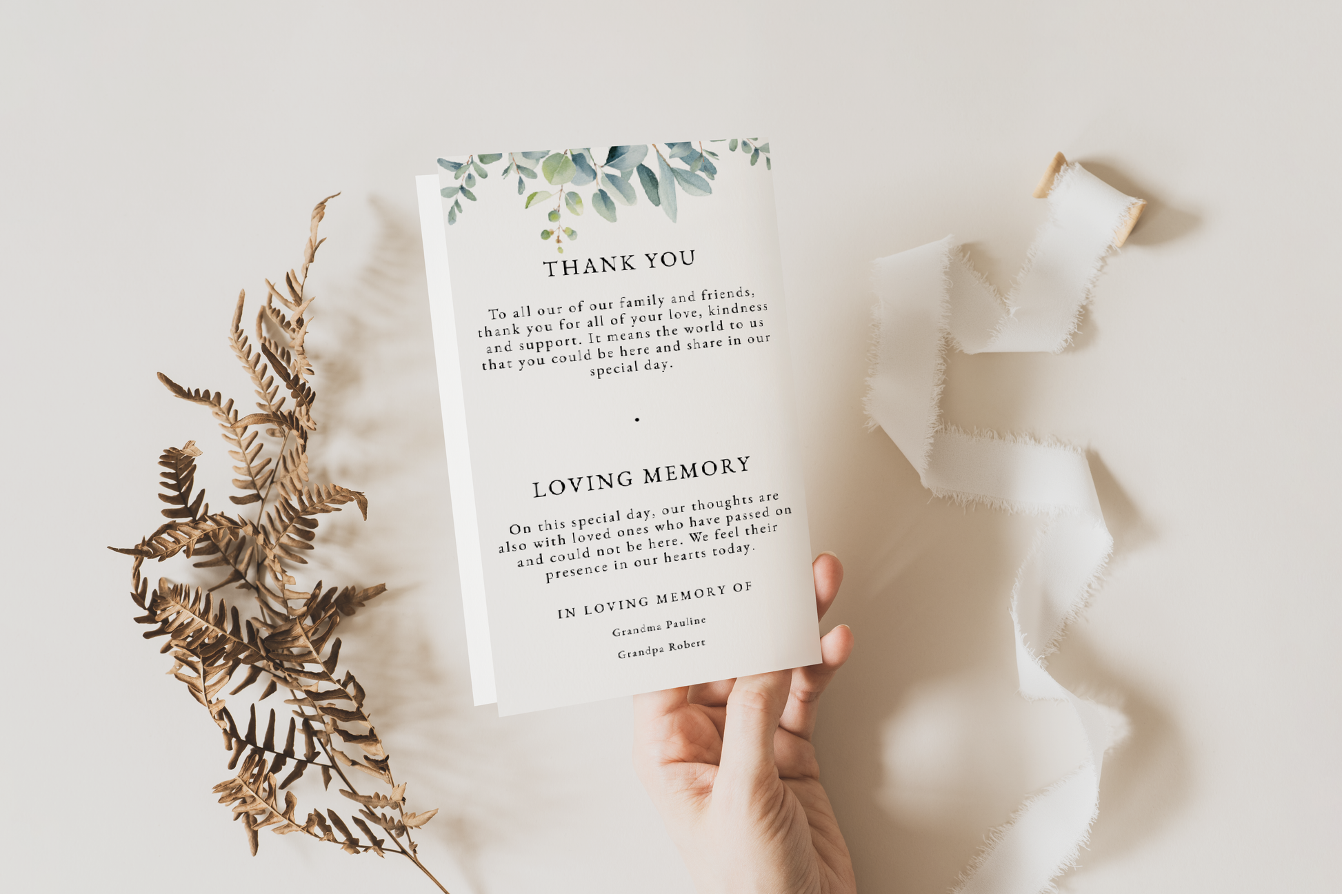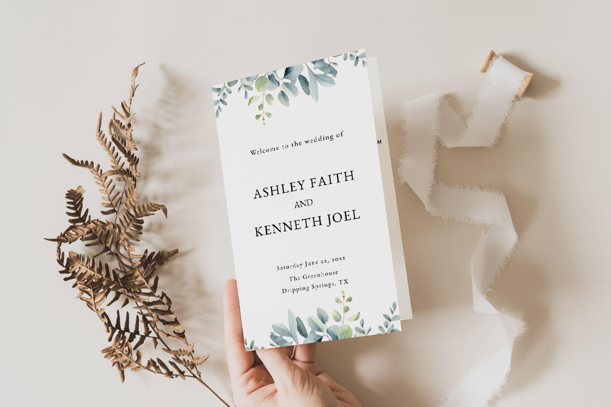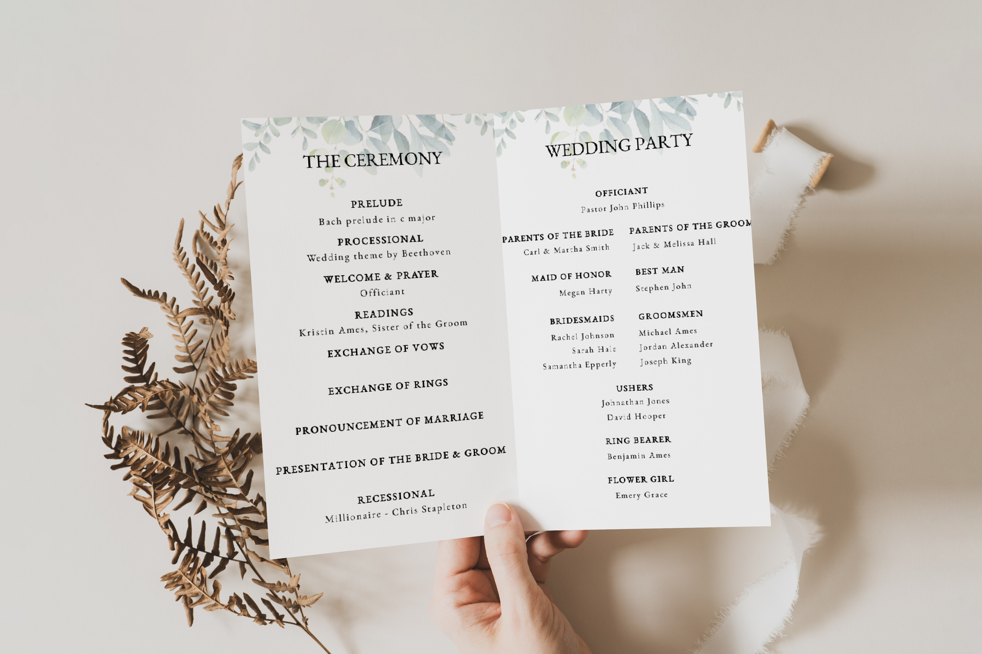 Looking for a beautiful and unique wedding program? Look no further than our eucalyptus program! This program is perfect for your upcoming ceremony. Our template is easy to use and can be customized to fit your needs. Plus, it's printable and instantly downloaded so you can get started right away. Add some greenery to your program with our eucalyptus design and you'll be ready to celebrate in style!