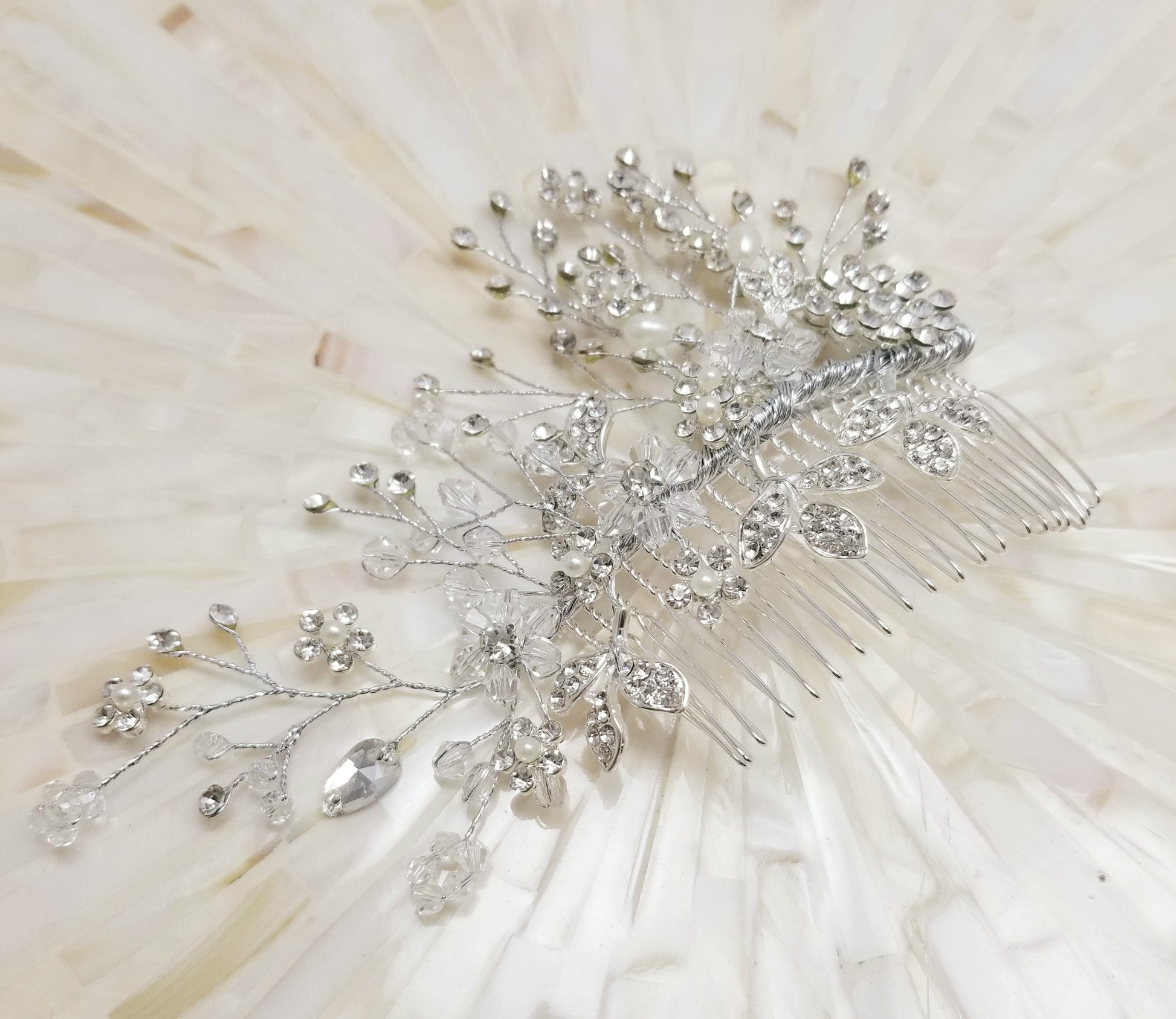 The decorative part of the hair comb measures approximately 6 inches long and 3 inches wide. Since each comb is handmade there may be slight variations in size and layout. Each bridal hair comb is truly unique and one of a kind!