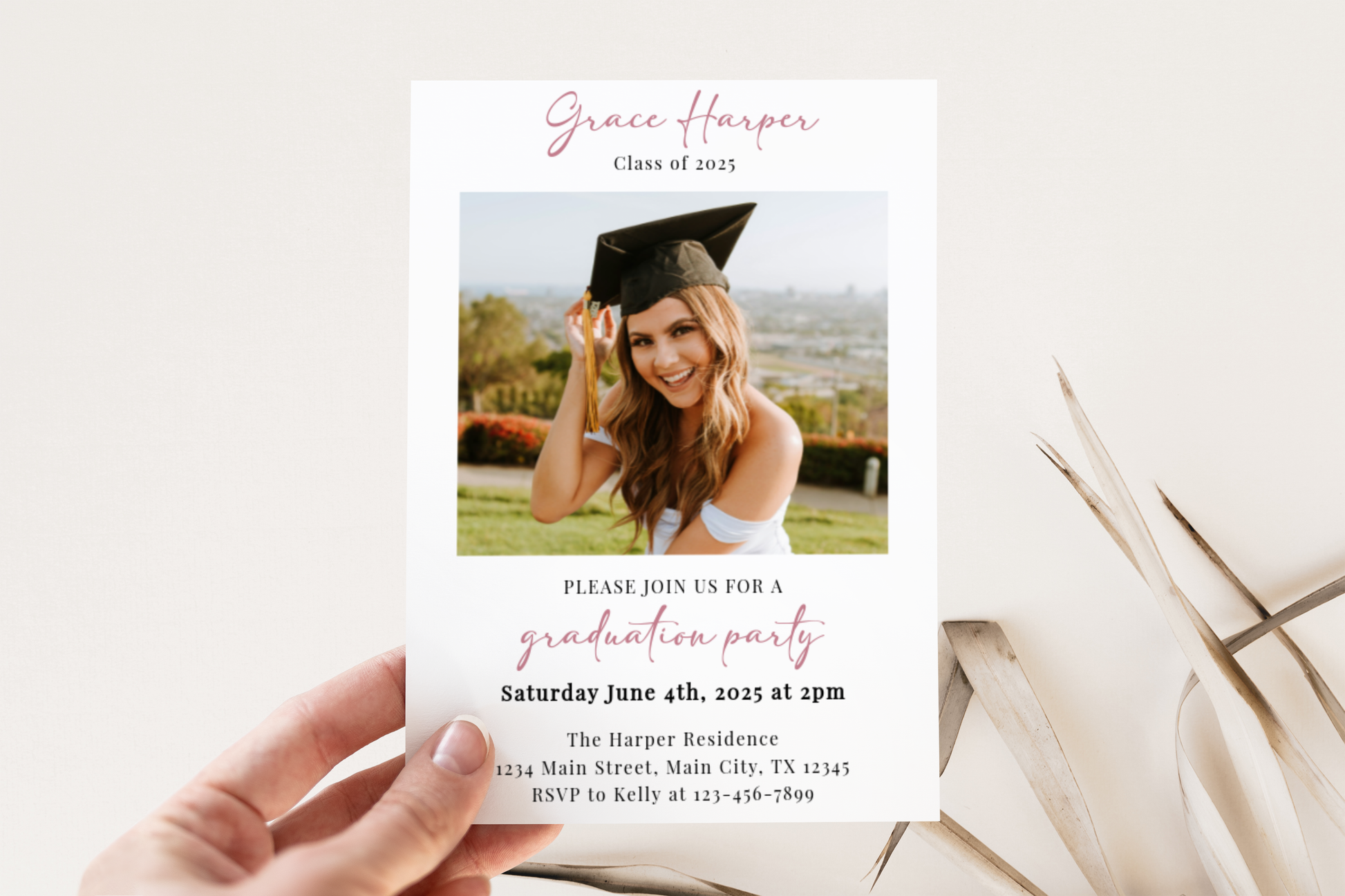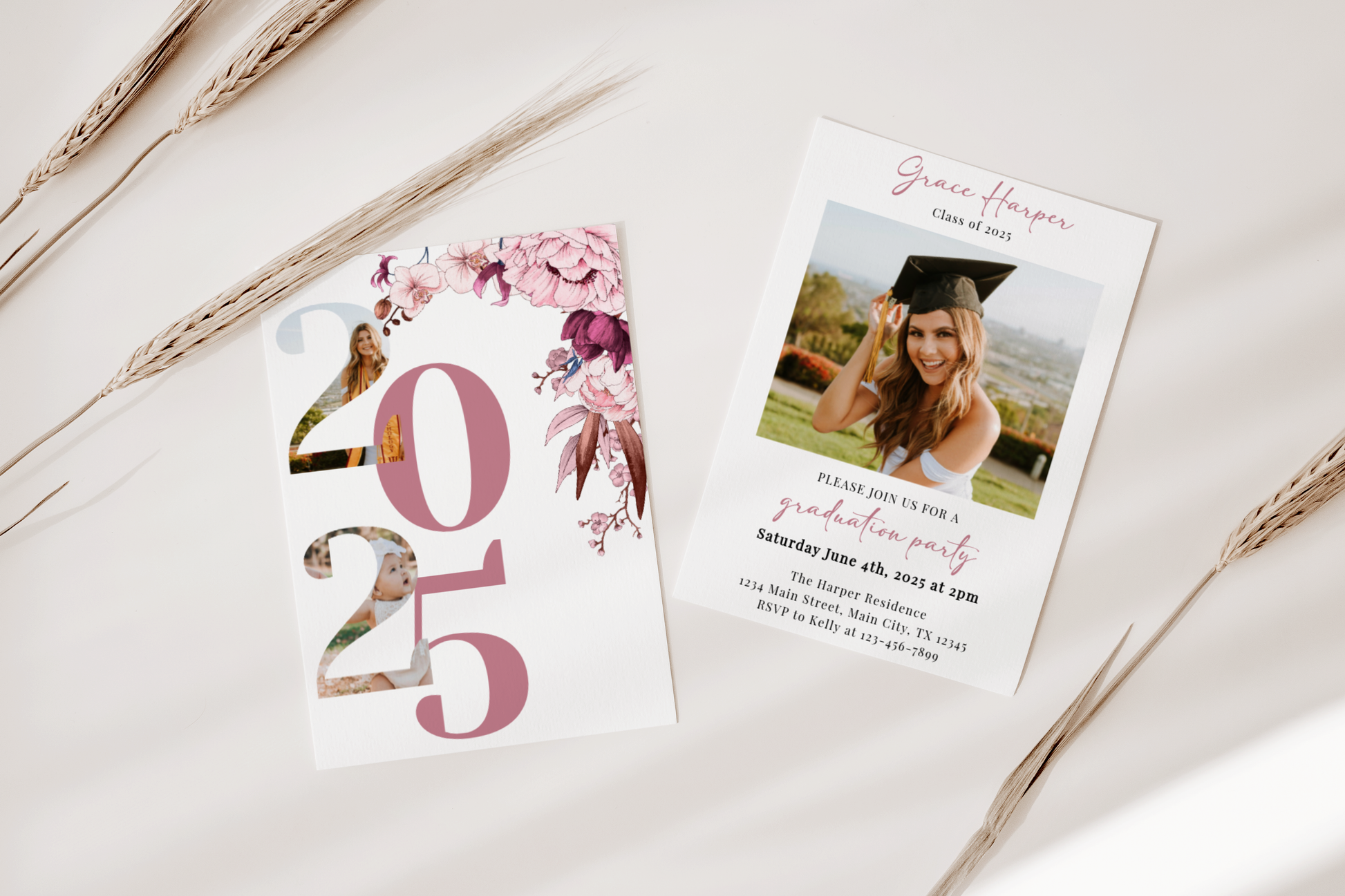 Gorgeous double sided graduation party invitation template with light pink and mauve florals. It's fully editable and easy to customize.