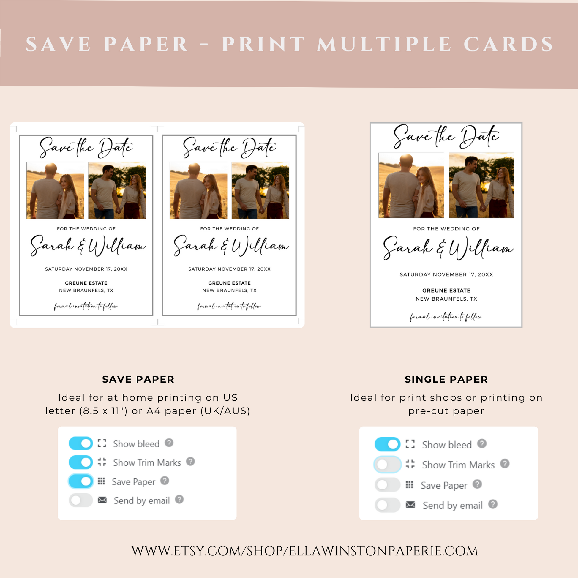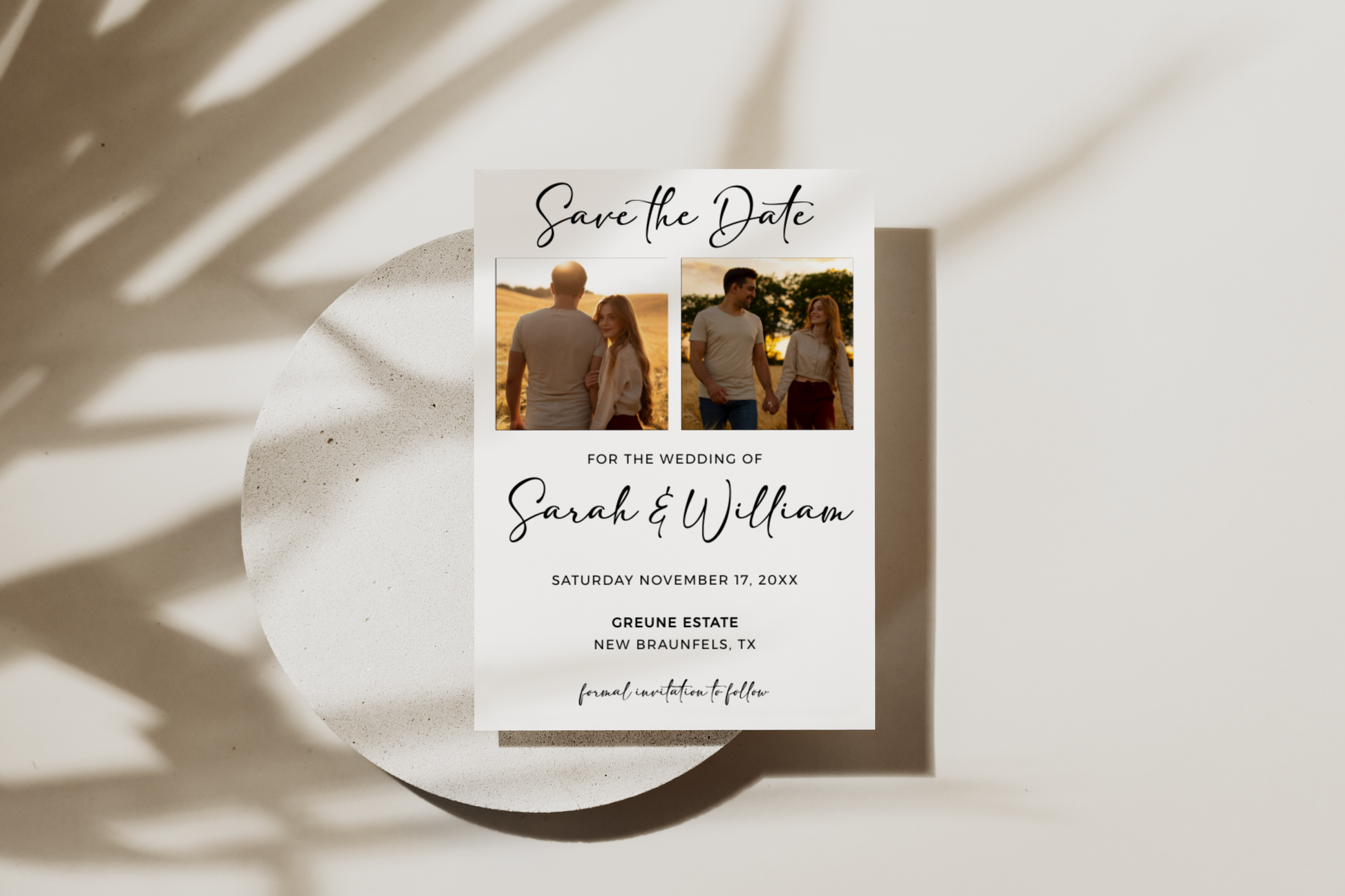 Modern minimalist double-sided save the date template with photos. Comes with one 5x7 inch double-sided save the date card. Easily editable and totally customizable.