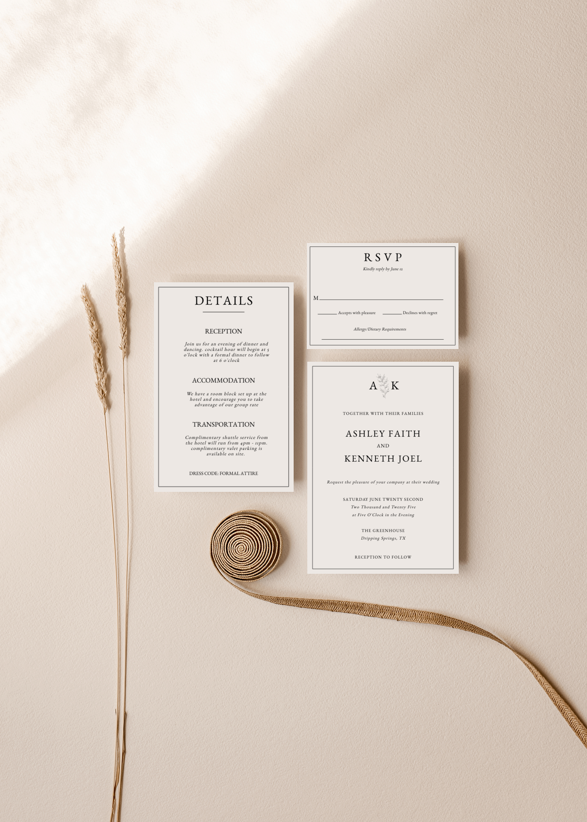 Modern minimalist monogram wedding invitation suite. Comes complete with one 5x7 invitation, one 4x6 details card and one 5x3.5 RSVP card. All are easily editable and totally customizable.