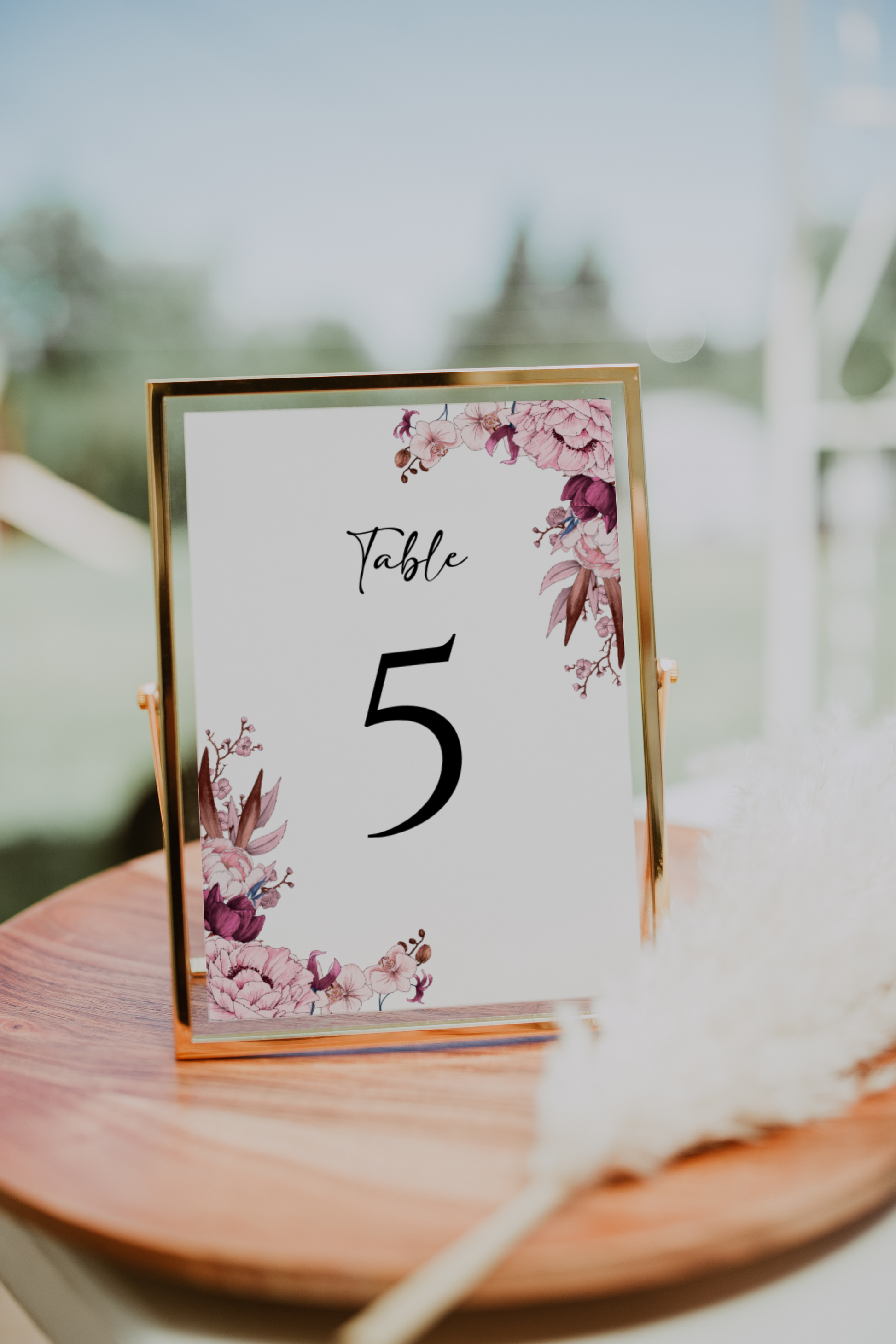 White, light pink and mauve floral table number sign template. Comes complete with one 4x6 sign, one 5x7 sign and one 8x10 sign in three color variations. All are easily editable and totally customizable.