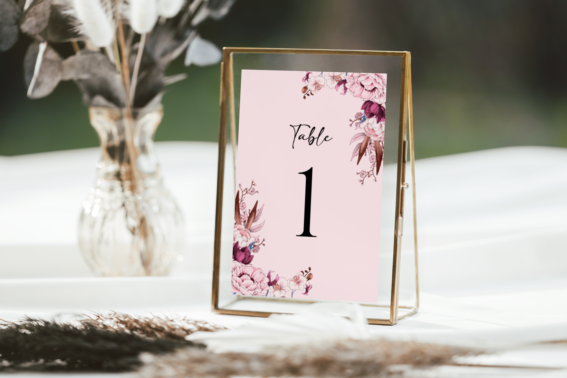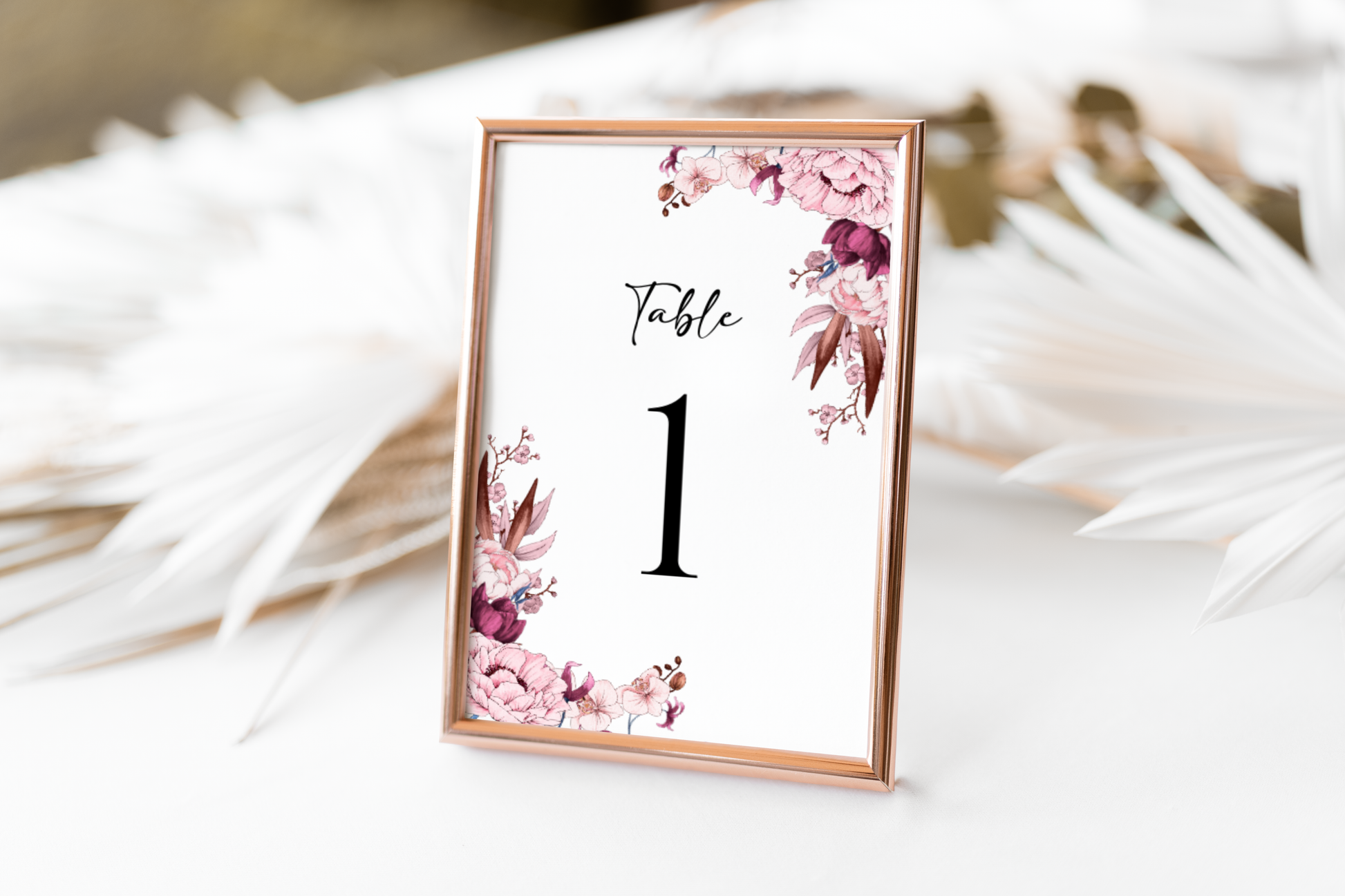 White, Light Pink and Mauve Floral Table Number Sign Template EWP004